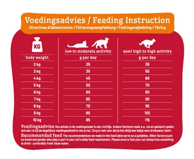 Vitaminen, mineralen en sporenelementen (per kg): vitamine A 25.000 IE, vitamine C 158 mg, vitamine D3 1.300 IE, vitamine E 600 mg, biotine 140 µg, ijzer 65 mg, koper 10 mg, mangaan 15 mg, zink 100 mg, Jodium 1,7 mg, selenium 0,2 mg, Taurine 1.500 mg, DL-methionine 5.000 mg, L-Carnitine 50 mg
